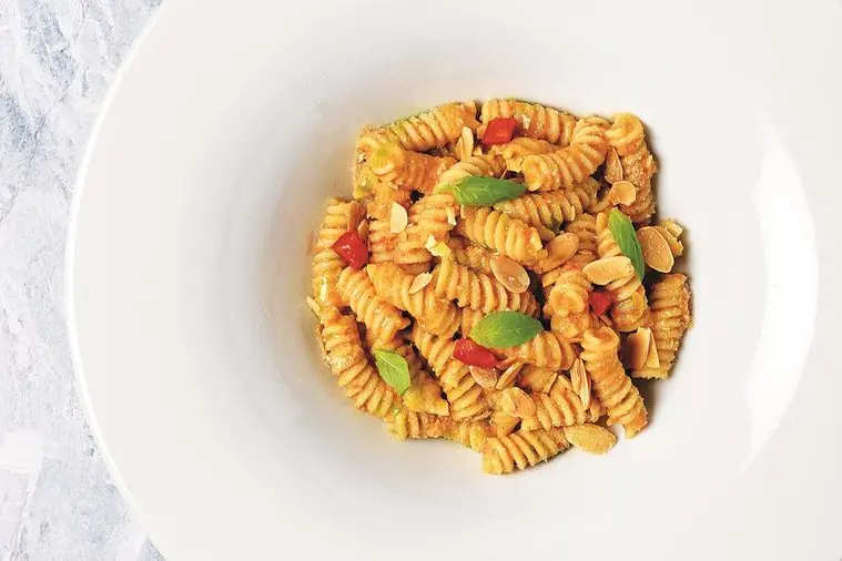 • Cuocere i fusilli in acqua bollente salata, scolarli e condirli con il pesto di pomodorini e mandorle.